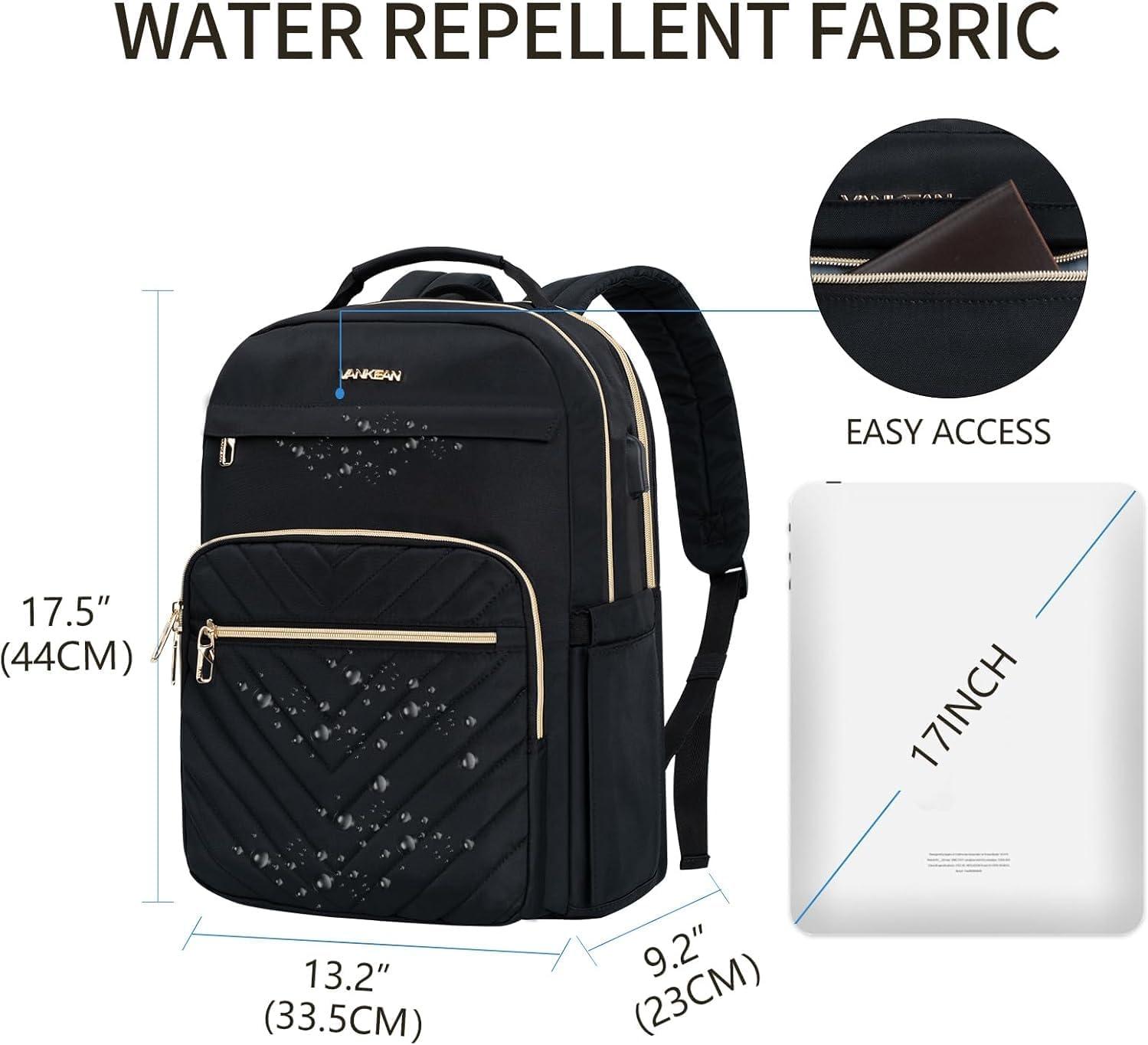 Fashion Black & Gold & Water Repellent Design Backpack: VANKEAN womens black laptop backpacks have exquisite gold-plated zippers and fashion stitch texture. Size Detail: 17″ H x 12.6″ L x 7.8″ W. Weight 1.76 lbs and easy to carry. The exterior material of the VANKEAN stylish lightweight backpack is waterproof and scratch-resistant nylon with a fully lined tear-resistant custom polyester interior.